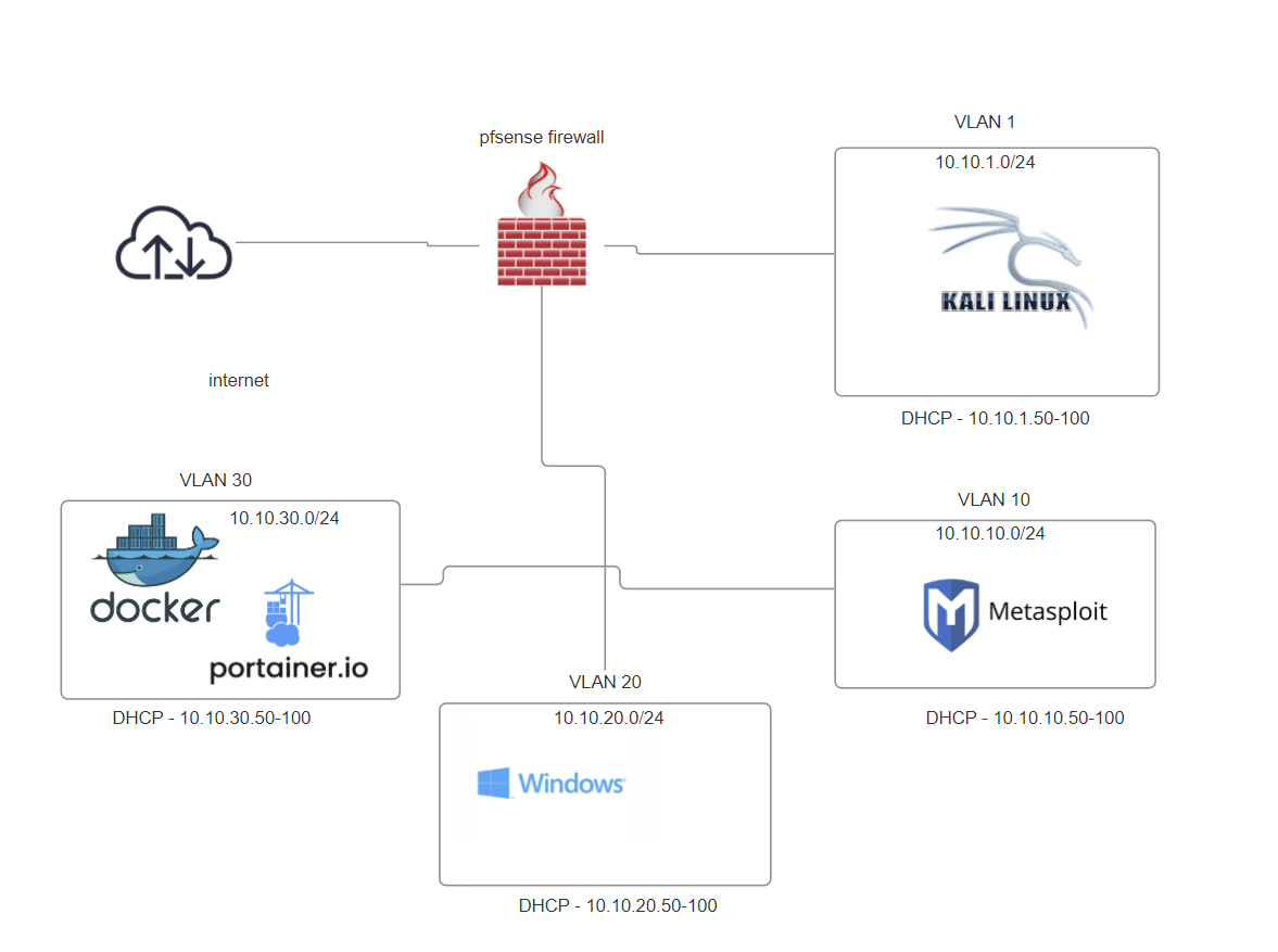 pfSense, Kali Linux, Windows, Docker, Portainer, Metasploitable, Proxmox